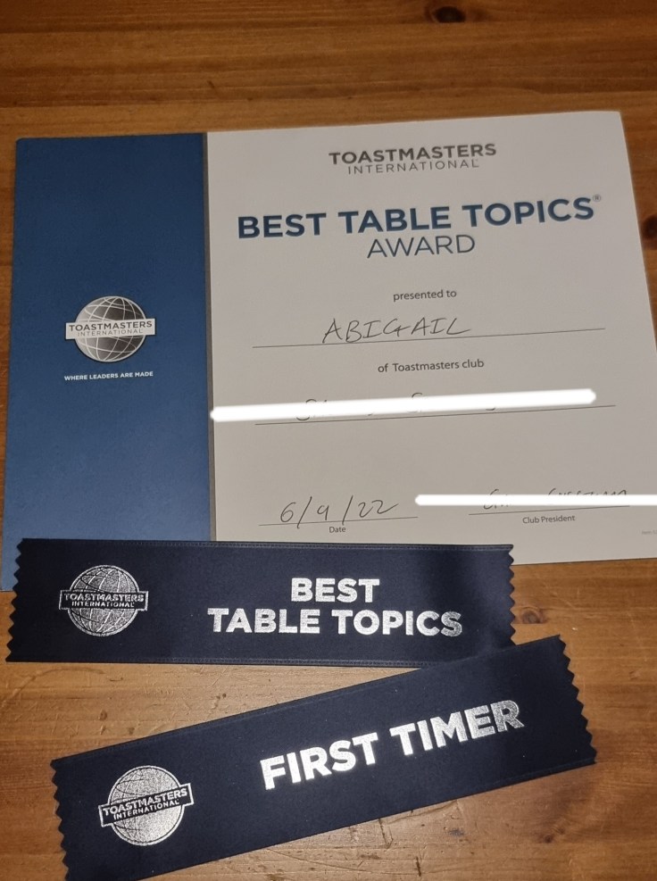 Here’s the format – at  the beginning of the meeting, following introductions, we dive straight into ‘table topics’ – an opportunity to practise impromptu public speaking based on an unknown topic or question. It’s daunting. It’s scary. But it’s exhilarating. The talk only requires between 1-2 minutes of speaking, but when standing in front of the ten or so people there – to me, unknown faces – time moves slowly.