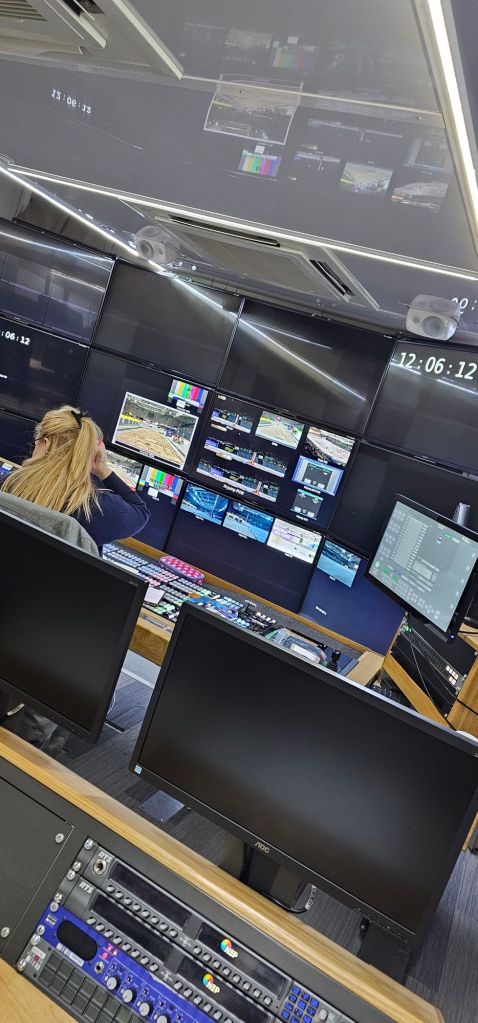 Imagine the complexity of directing and broadcasting live athletics via over 20 cameras set up across the arena, with up to four separate disciplines happening simultaneously! The level of focus, precision, and intentionality required is nothing short of remarkable. Witnessing the seamless coordination between the director, producer, and assistant producer (aka ‘AP’) in the control room was akin to observing Mihaly Csikszentmihalyi’s concept of ‘flow’ in action – but on a collective scale, like a perfectly synchronized record-breaking rowing squad (think – Boys In The Boat).